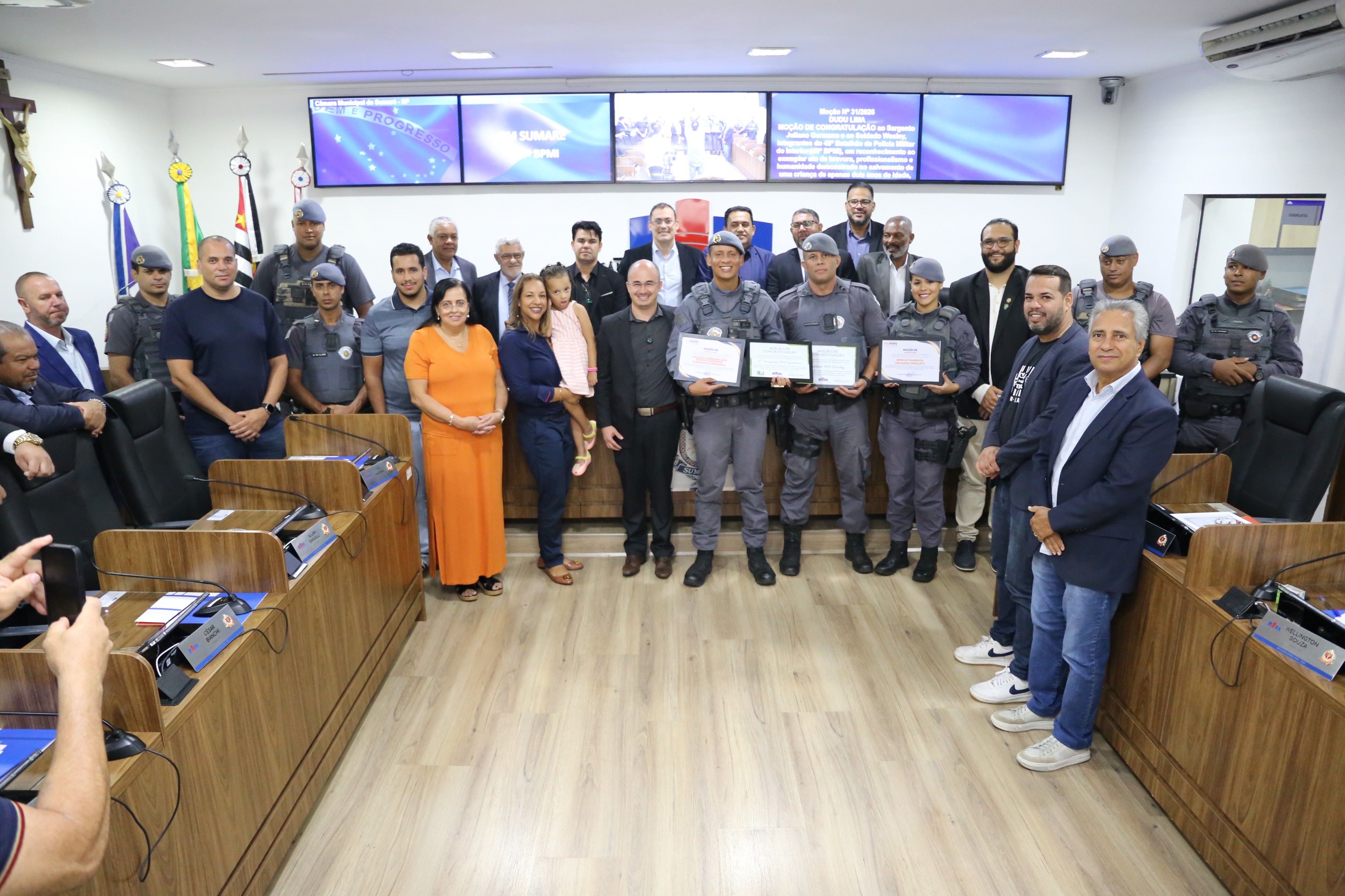 A sessão ordinária da Câmara de Sumaré desta terça-feira (10) foi marcada por homenagens a policiais militares, policias civis e guardas municipais. Os vereadores Rai do Paraíso (Republicanos) e Dudu Lima (Cidadania) apresentaram moções de congratulação aos policiais Sargento Juliano Ferreira dos Santos Germano e ao Soldado Weslley Barboza, integrantes do 48º Batalhão de Polícia Militar do Interior (48º BPMI), pelo resgate de uma criança de dois anos em uma situação de sequestro.