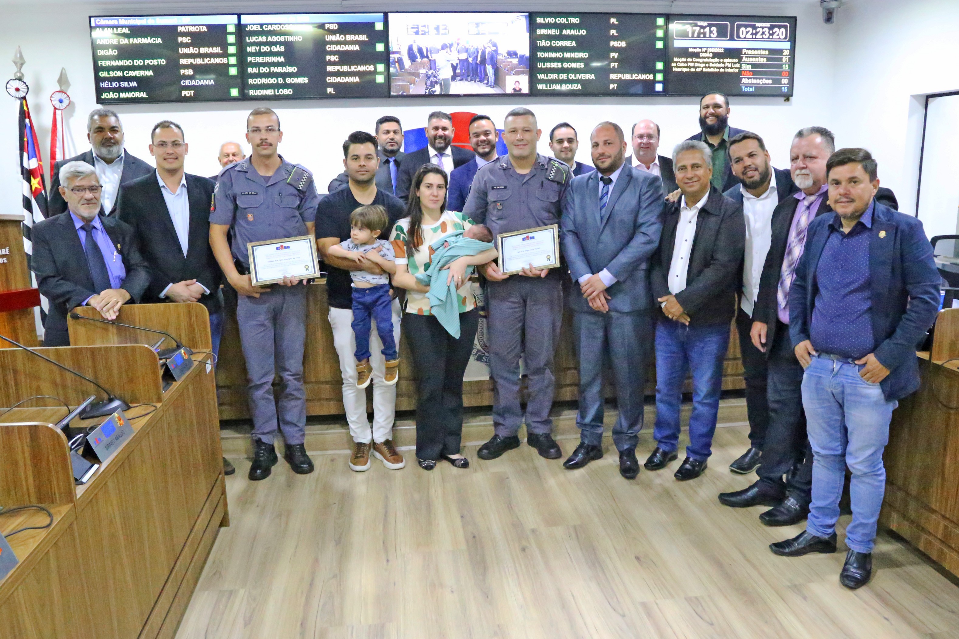 Vereador Digão entregou homenagem ao cabo Diego Líria Natali e ao soldado Luiz Henrique da Cruz, que resgataram o pequeno Felipe, de 11 dias de vida